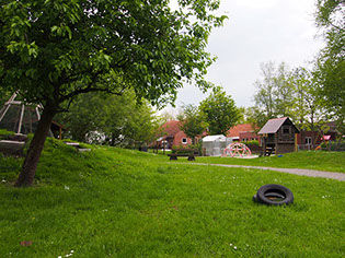 Das ca. 4000 qm große Außengelände ist sehr vielfältig gestaltet. Dort finden die Kinder naturnahe Bereiche wie z.B. das Wäldchen und einen Schloot, die zum Matschen, Verstecken und Spielen einladen, und Naturerfahrungen ermöglichen. Zum Außengelände gehören auch ein Gewächshaus und mehrere Beete, die mit den Kindern zusammen gepflegt werden. Desweiteren laden viele verschiedene Spielgeräte (u.a. Schaukeln, eine Wippe, eine Rutsche, eine Matschanlage, ein Hügel, Sandkästen, Klettergerüste) zum gemeinsamen Spielen ein. Auf der Fahrzeugbahn können zahlreiche altersgemäße Fahrzeuge (Bobbycars, Dreiräder, Laufräder, Kettcars, etc.) gefahren werden. Seit diesem Jahr zählt der Krippenspielplatz zu unserem Außengelände. Der Krippenspielplatz ist eine Rückzugsmöglichkeit für die Krippenkinder und bietet den Kindergartenkindern einen etwas ruhigeren Spielort, natürlich nur für eine begrenzte Anzahl an Kindern. Dieser Spielplatz ist durch eine Hecke und einem Tor zum großen Kindergartenspielplatz abgetrennt. Hauptbestandteil dieses Spielplatzes ist eine krippengerechte Spiellandschaft. Die Spiellandschaft lädt ein zum Klettern, Rutschen und Erkunden ein. Auch befindet sich dort ein kleiner Hügel, den die Kinder erklimmen können, sowie eine Nestschaukel und ein alter Baumbestand, der den Kindern als Sonnenschutz und verstecken dient.