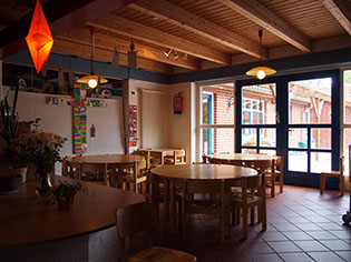 Im Zentrum der Kindertagesstätte befindet sich unsere Cafeteria. Hier treffen sich die Kinder und die Mitarbeiter zum Essen und Trinken. Die Cafeteria kann zu einem geschützten Innenhof geöffnet werden und bietet somit auch die Möglichkeit zum Essen im Freien. Angrenzend an die Cafeteria befindet sich der Eingangsbereich. Dieser wird genutzt um Informationen für die Eltern auszuhängen.