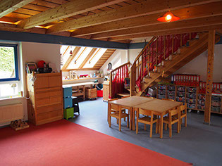 Unsere Krippe ist hell und geräumig. Hier haben die Kinder die Möglichkeit, sich über verschiedene Spielebenen zu entfalten. Direkt angrenzend gibt es noch den Ruheraum, in dem sich eine Schlafburg über zwei Ebenen befindet. Die Kinder können hier ihren Schlafgewohnheiten nachkommen. Neben dem Ruheraum befindet sich der Sanitärbereich, der mit zwei extra niedrigen Toiletten für Kleinkinder, einer Wickelkommode, einem länglichen Waschbecken und einer Badewanne ausgestattet ist. In der Wickelkommode hat jedes Kind ein Fach, für Windeln und Ersatzkleidung.